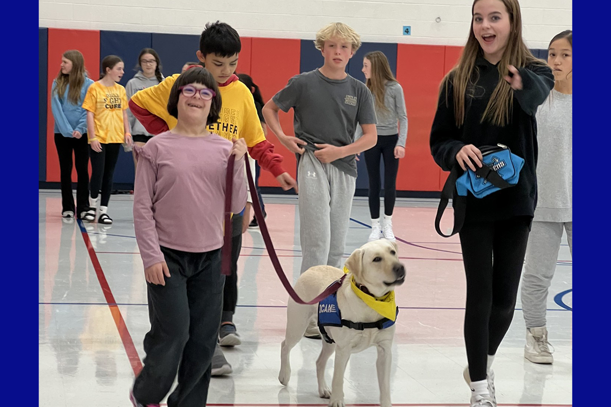 In Adaptive Physical Education, students with cognitive disabilities are paired with eighth graders for “Walk and Talks,” which is a time to connect with peers through movement and conversation. Royal is trained to walk calmly with the students, providing support and encouragement.