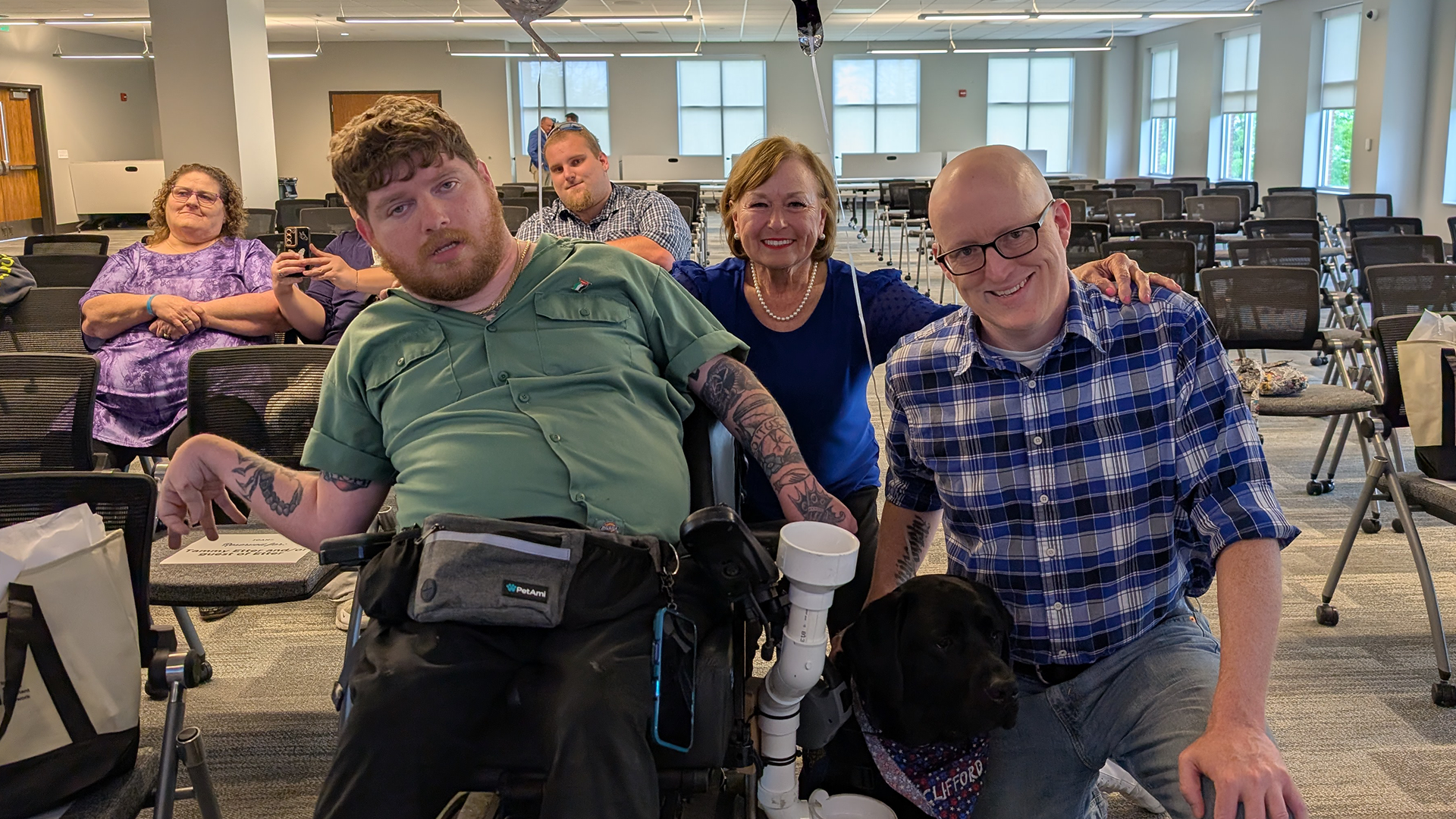 During one training outing, Clifford visited an assisted living facility where Mike’s aunt and uncle lived. While there, Clifford practiced skills like walking calmly next to an electric wheelchair and pressing automatic door buttons with his nose. Later, Clifford graduated and was paired with a client who needed a dog capable of performing these exact skills.